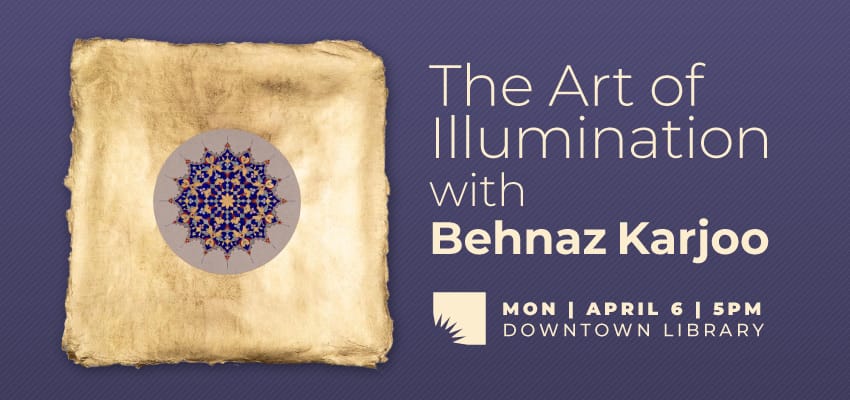 April 6, 2026, 5:00–6:00 PM — AADL Downtown Library, Ann Arbor Join New York-based artist Behnaz Karjoo for a presentation on the art of illumination (tahzib), a traditional intricate art form focused on decorating manuscripts, calligraphic texts, and historically Qur'ans using gold paint, gold leaf, and vibrant natural pigments. Derived from the Arabic word "zahab" (gold), tahzib translates to "gilding." This is AADL's featured in-person event for Arab American Heritage Month, presented in partnership with Reed Society for the Sacred Arts. Free.